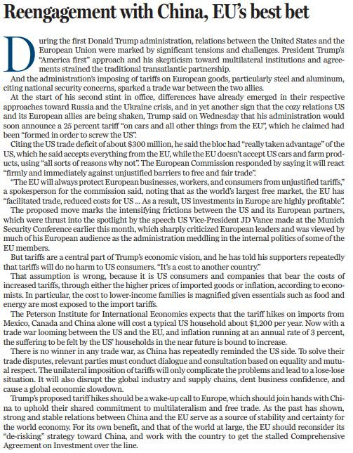 特朗普的关税政策,给欧洲敲响了警钟。欧洲应与中国携手,共同履行对多边主义和自由贸易的承诺。历史经验表明,牢固的中欧关系,将为世界经济注入更多稳定性和确定性。为了自身和全球利益,欧盟应重新考虑其对华“去风险”战略,与中方一道,推动陷入僵局的《中欧全面投资协定》重回正轨。